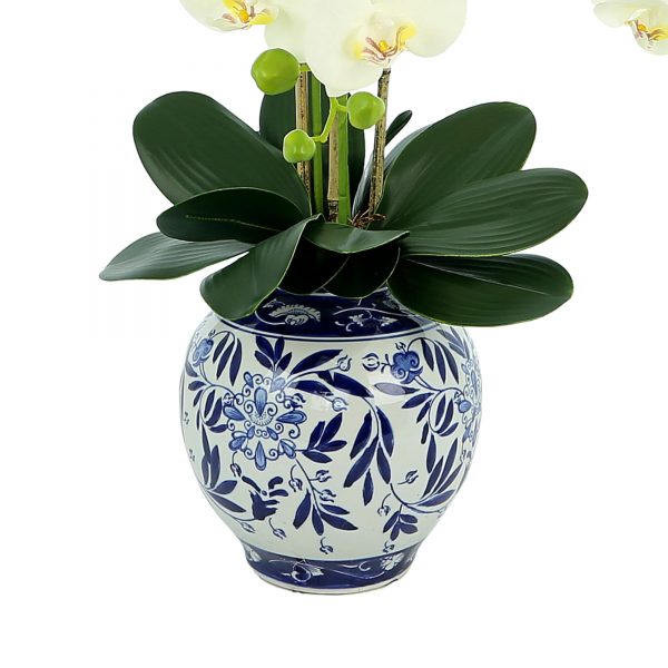 Bring the beauty and elegance of a nature indoors with our orchid floral arrangement. Featuring luminous white orchids artfully arranged in a decorative blue and white ceramic vase, this timeless display will make any space feel lighter, brighter, and more inviting. Perfect for any home or office, the impressive design is handcrafted with orchid leaves to bring a touch of outdoors inside. Enjoy the calming presence of such a giving raw botanical beauty without the worry of having to care for it – no watering or maintenance required! With its traditional design, our floral arrangement adds an inviting vibe that’s welcoming and comforting, easily matching any decor you have in your space.