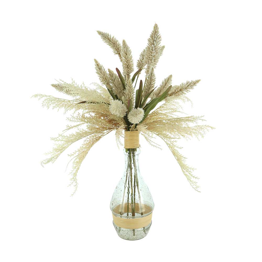 Bring a touch of the outdoors inside with this stunning Pampas and Pennisetum Arrangement! This luxurious handcrafted design is made out of cream and beige pampas and Pennisetum, creating an unforgettable effect that will enhance any style of décor. Display in your living room or home office to create a tranquil environment that’s perfect for unwinding after a long day. Plus, you won’t have to worry about watering or doing any maintenance – this arrangement takes care of itself! Perfect for busy people who don’t want to miss out on having some greenery around the house. Make it yours today so you can enjoy the beauty of nature indoors all year round.