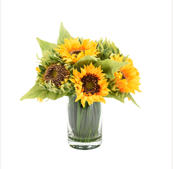 Are you in the mood for a cozy fall season look? Look no further than this handcrafted sunflower arrangement! This vase-contained beauty is full of warm yellow shades of bright sunflowers, paired with grass and realistic looking water. Let this piece be the eye-catching addition to your home or office that it was destined to be. With no watering or maintenance required, this easy to place décor takes seconds to set up and will breathe life into any space with its deep autumn vibes. Bring a lovely touch of the outdoors indoors when you add this joyful sunflower arrangement to your collection!